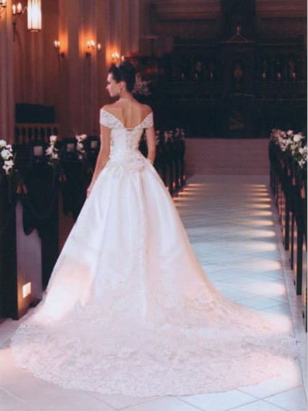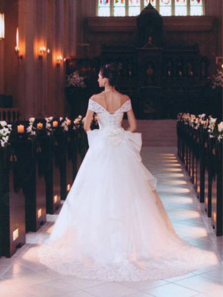 チャペルではロングトレーン、ショルダーをつけて、ゴージャスに厳かに。