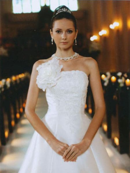 パーティではトレーンをはずして、ビスチェタイプにコサージュをつけて可愛いドレスに早がわり。