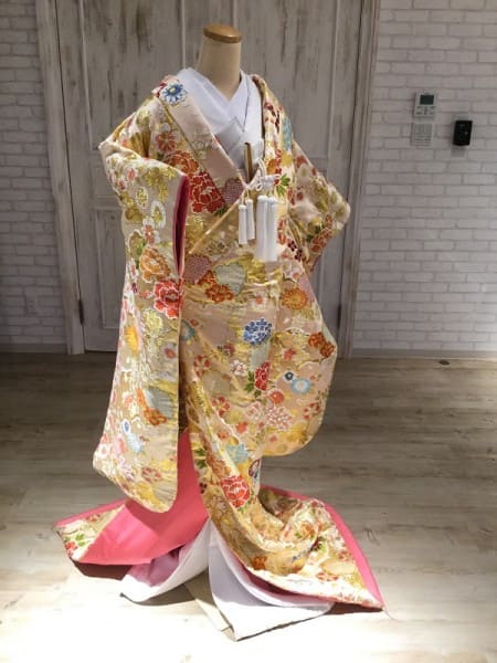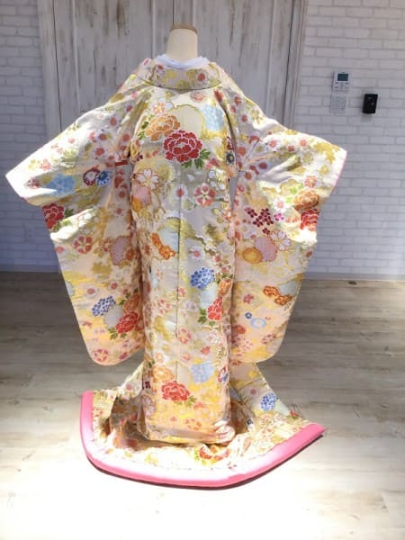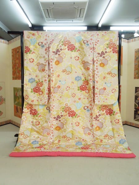 つやめく緞子の生地に豊かな花々を優しい彩りで織り上げました。