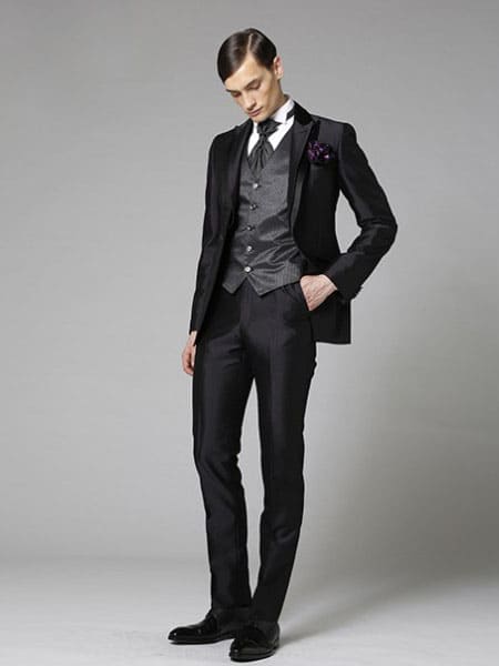 スーパーブラックを配した拝絹は構築的な2枚仕立てのピークドラペル
