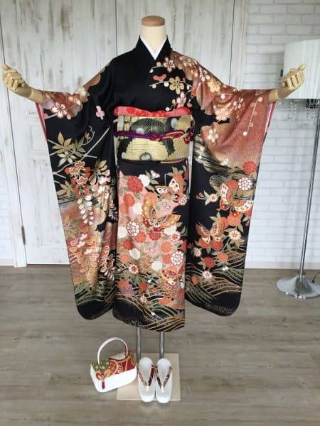 黒の振袖に、華やかな藤や菊があしらわれており、大変上品な振袖になっております。