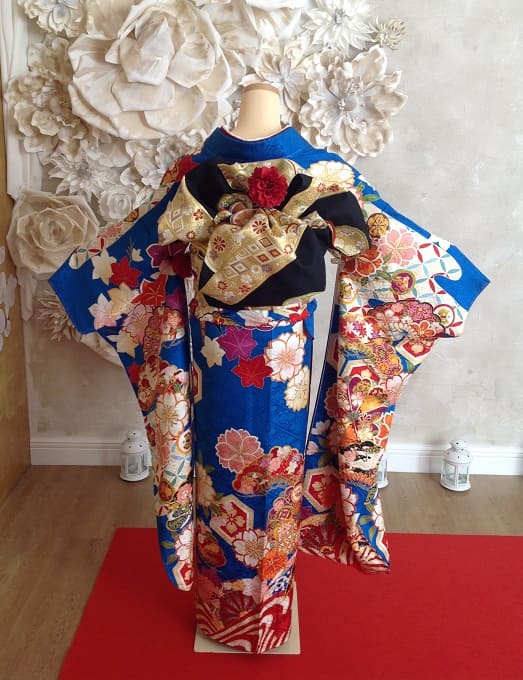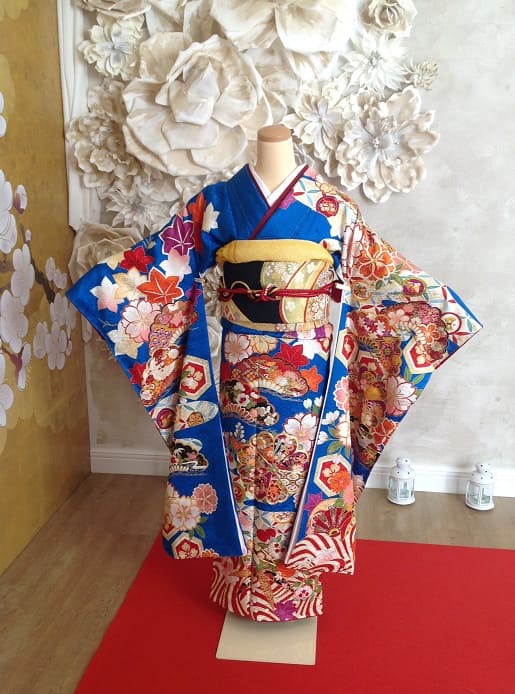 鮮やかな青生地に色々な和柄が入っており、 華やかで魅力な一着になっております。