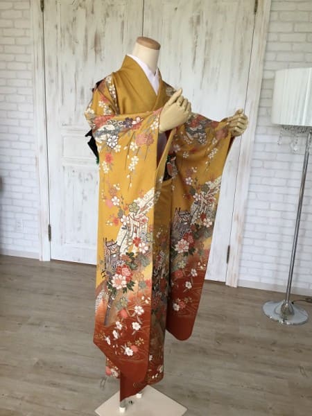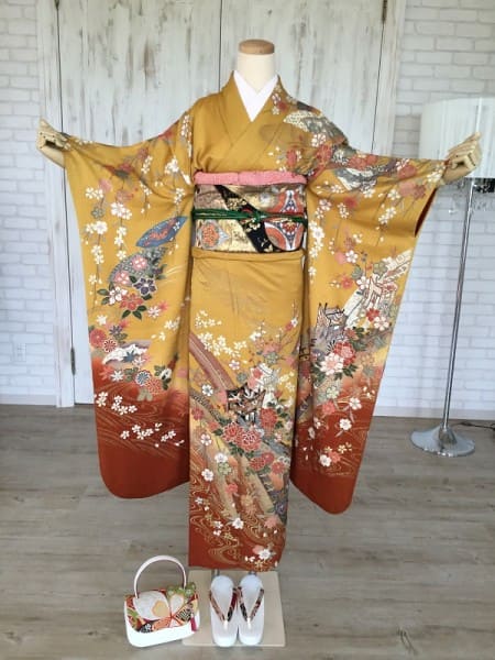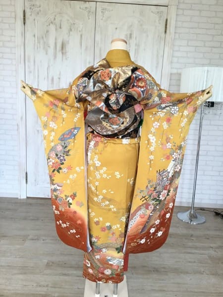 おもに黄色で統一されており、右袖には御所車があり、おめでたい模様がたくさんあしらわれております。
