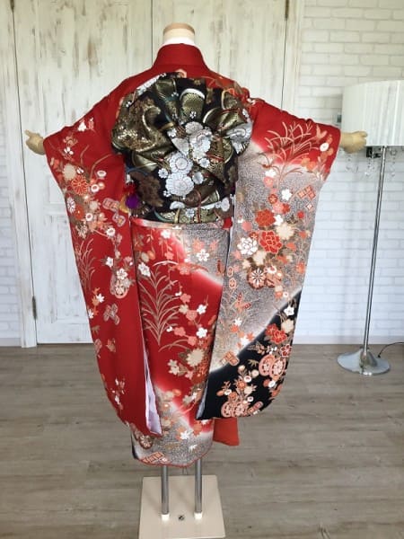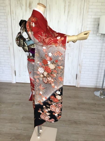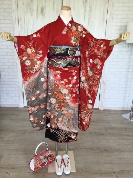 全体的に赤でまとまっている振袖ですが たくさんの文様が入っており、とても華やかな振袖になっております。