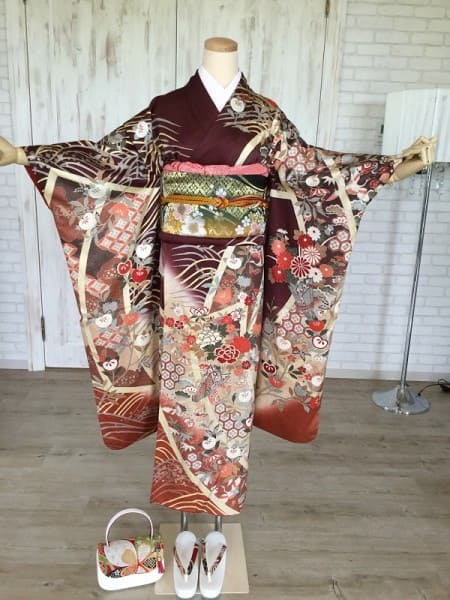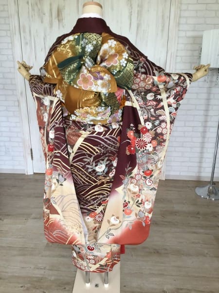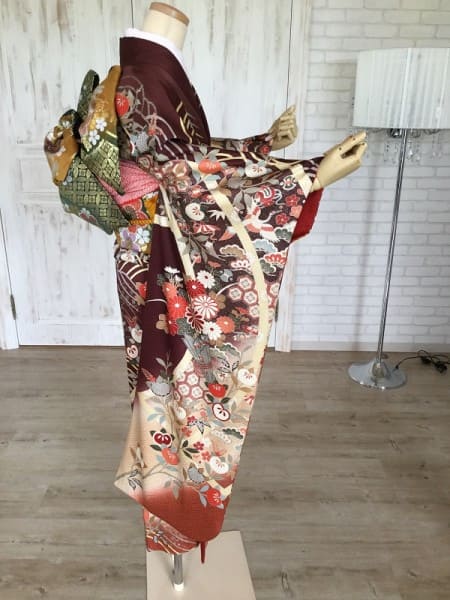 臙脂色をあしらっており、たくさんの文様をつかっている大変華やかな振袖になっております。