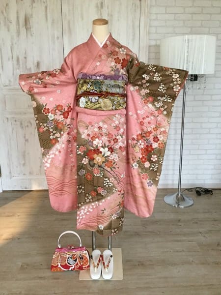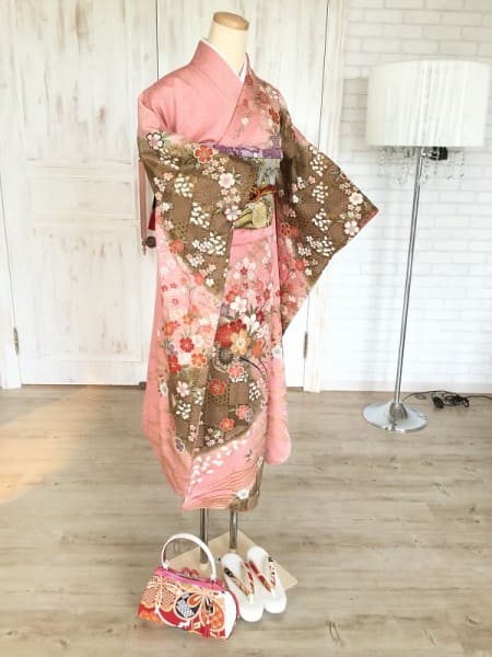 桜が散りばめられているピンク色の振袖。とても可愛らしい振袖になっております。