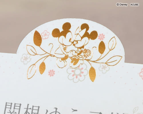 ミッキーマウスとミニーマウスが魔法のブランコに乗って幸せいっぱいの愛らしい席札セットです。
