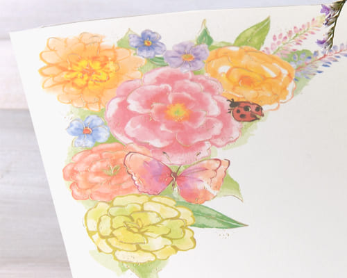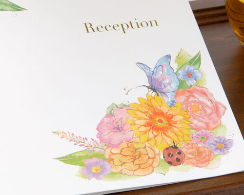 そよ風に揺れる花々を水彩タッチの鮮やかなカラーで彩った席次表のセットです。