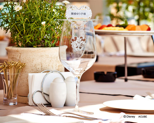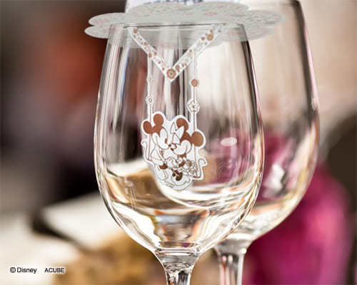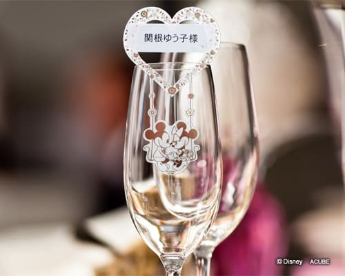 ミッキーマウスとミニーマウスが魔法のブランコに乗って幸せいっぱいの愛らしい席札グラスタイプセットです