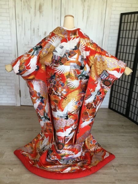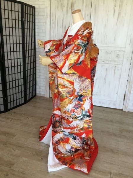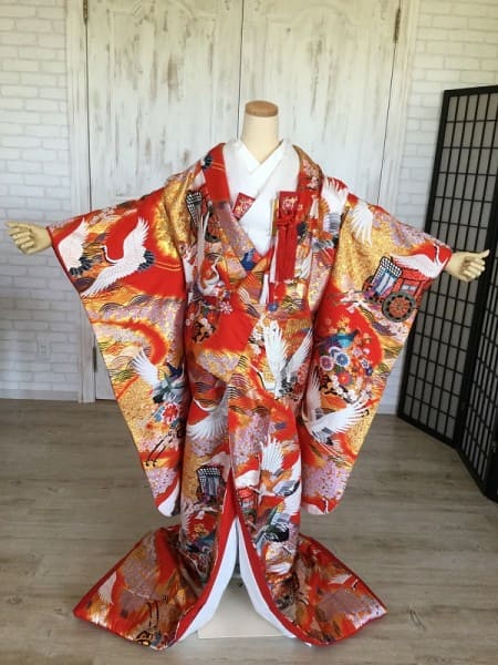 鮮やかな朱赤にたくさんの鶴と御所車が描かれているとても明るい色打掛