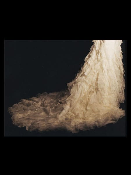 全体に散りばめられたビーズとトレーンのレース&フリルが上品さを見出してくれます。