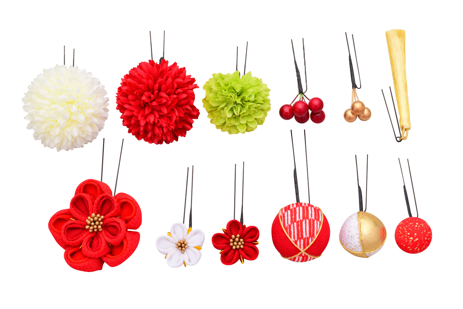 飾りはすべて別々に分かれて、留め具はシンプルなUピン仕様です。 アレンジ性に優れヘアスタイルに合わせて全体に散りばめたり、集め合わせたりと自在に使用できます。 華やかに飾りたいハレの日の振袖スタイルからカジュアルに飾りたい浴衣スタイルや週末のお出掛けまでシーンに合わせて飾りの調整も可能です。 また、インテリアとして身近におけるので普段使いがしやすく飾りは1つから簡単に取り出せ髪に飾れます。