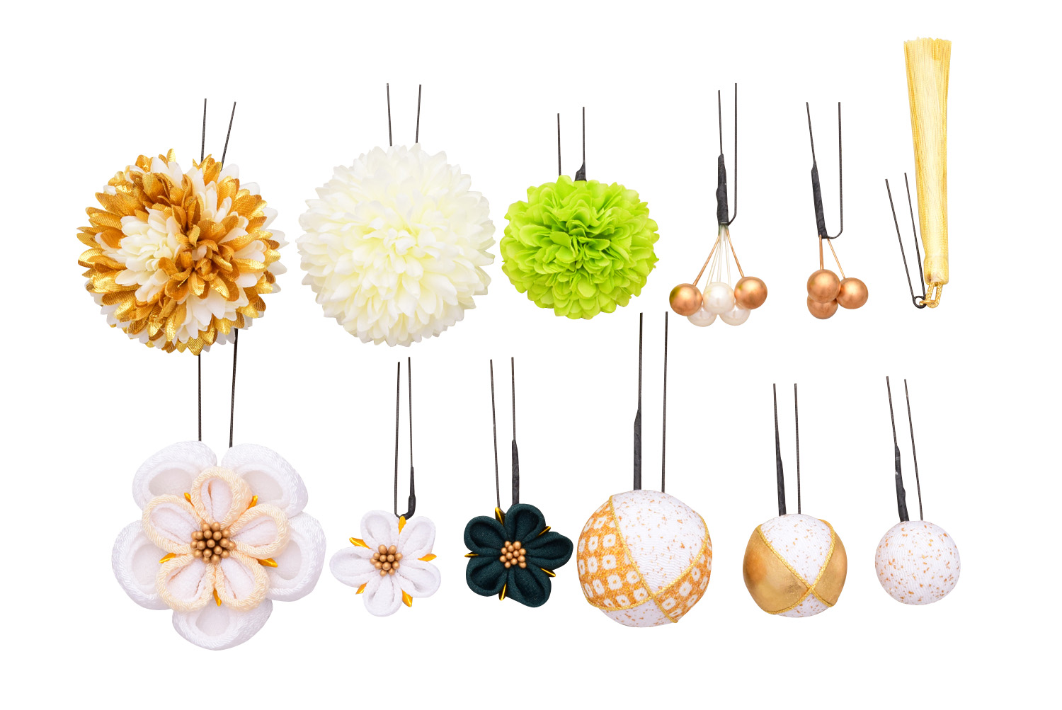 飾りはすべて別々に分かれて、留め具はシンプルなUピン仕様です。 アレンジ性に優れヘアスタイルに合わせて全体に散りばめたり、集め合わせたりと自在に使用できます。 華やかに飾りたいハレの日の振袖スタイルからカジュアルに飾りたい浴衣スタイルや週末のお出掛けまでシーンに合わせて飾りの調整も可能です。 また、インテリアとして身近におけるので普段使いがしやすく飾りは1つから簡単に取り出せ髪に飾れます。