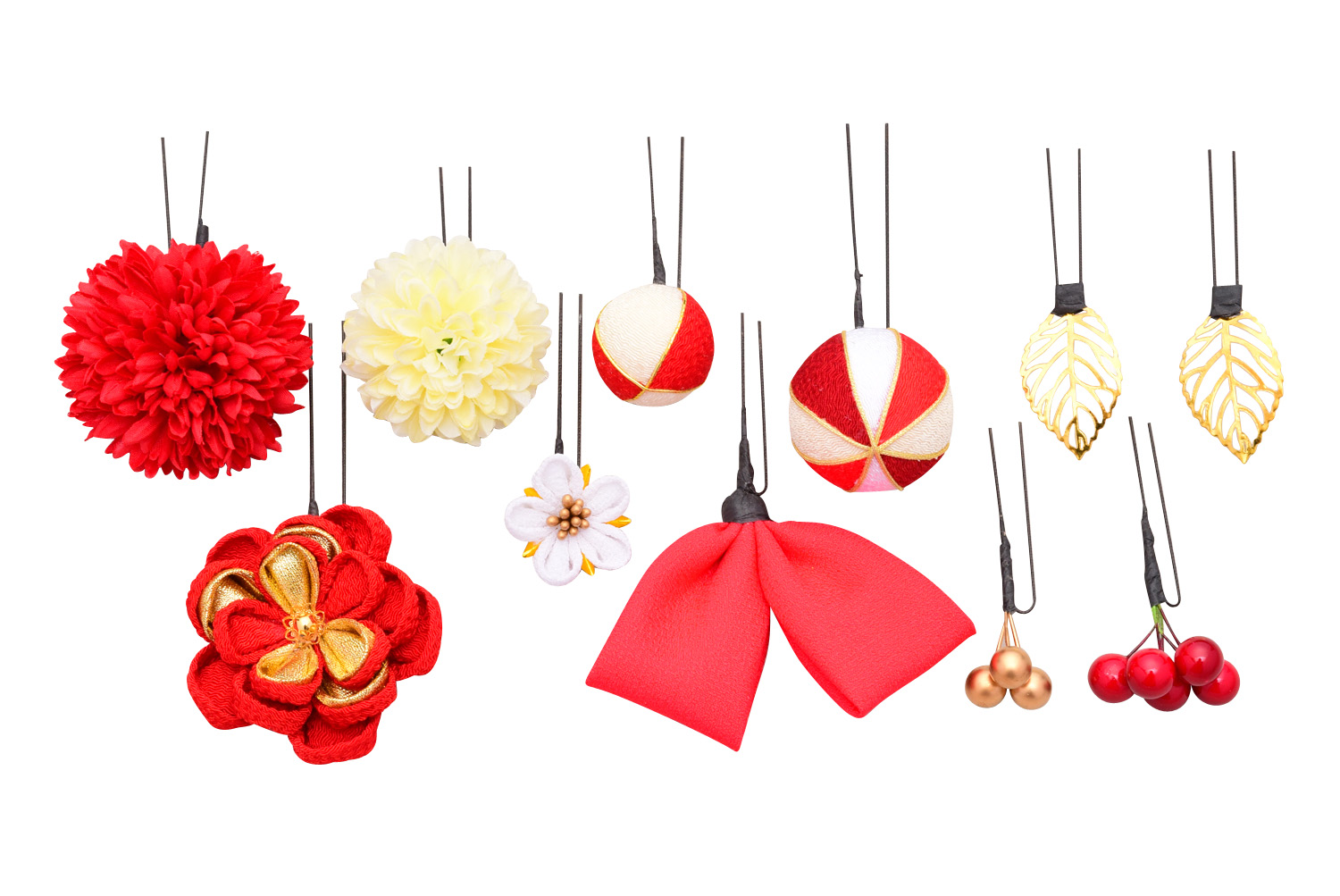 飾りはすべて別々に分かれて、留め具はシンプルなUピン仕様です。 アレンジ性に優れヘアスタイルに合わせて全体に散りばめたり、集め合わせたりと自在に使用できます。 華やかに飾りたいハレの日の振袖スタイルからカジュアルに飾りたい浴衣スタイルや週末のお出掛けまでシーンに合わせて飾りの調整も可能です。 また、インテリアとして身近におけるので普段使いがしやすく飾りは1つから簡単に取り出せ髪に飾れます。