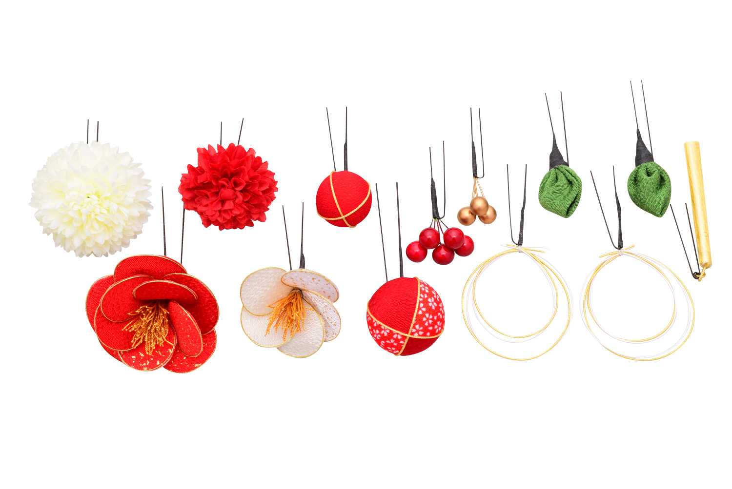 飾りはすべて別々に分かれて、留め具はシンプルなUピン仕様です。 アレンジ性に優れヘアスタイルに合わせて全体に散りばめたり、集め合わせたりと自在に使用できます。 華やかに飾りたいハレの日の振袖スタイルからカジュアルに飾りたい浴衣スタイルや週末のお出掛けまでシーンに合わせて飾りの調整も可能です。 また、インテリアとして身近におけるので普段使いがしやすく飾りは1つから簡単に取り出せ髪に飾れます。